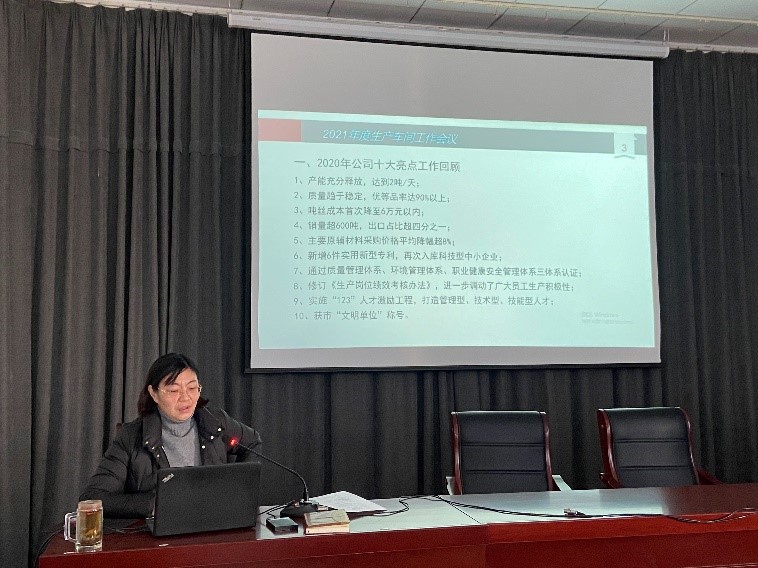 會(huì)上,公司副總經(jīng)理王爽芳總結(jié)了2020年公司十大亮點(diǎn)工作,部署2021年生產(chǎn)重點(diǎn)工作。公司總經(jīng)理助理李洋總結(jié)了2020年生產(chǎn)車間管理工作,提出車間2021年“5S”管理目標(biāo)。