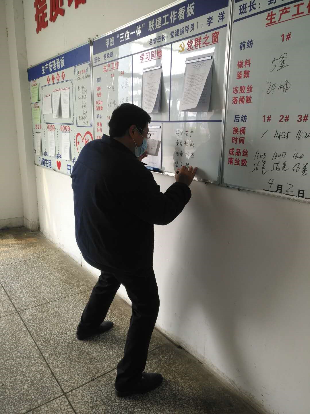 圖為生產(chǎn)設(shè)備部副部長(zhǎng)王勇為甲班書(shū)寫班組口號(hào)。