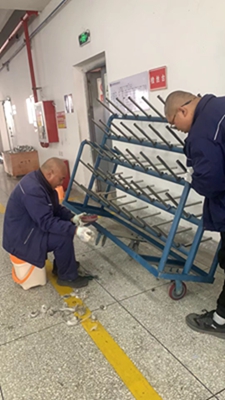 維修臺車時,我當起了孫師傅的下手,一邊將臺車穩(wěn)住不能傾倒,一邊看著孫師傅卸下每個車輪子并進行仔細清理,不怕臟、不怕累,毫無怨言,一絲不茍,動作利落,手法嫻熟,親身直面他的高效率和專業(yè)水平。他還對我詳細解說,讓我理解每個步驟的重要性和關(guān)鍵點。我們蔣姐也過來幫忙,不停的清掃臺車上清理出來的垃圾……