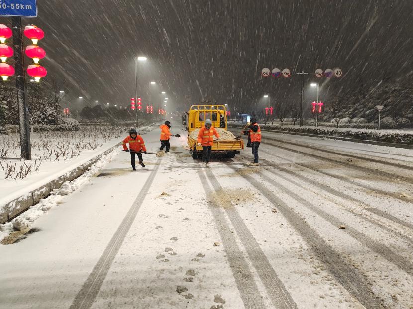 深夜時(shí)分,該公司負(fù)責(zé)人趙陽、副經(jīng)理孫振剛等領(lǐng)導(dǎo)班子成員及管理人員,帶領(lǐng)徐育華、王永等數(shù)名工人,對(duì)花果山大道及轄區(qū)易積雪區(qū)域和橋梁陡坡處、事故多發(fā)處開展清雪除冰工作。盡管刮著寒風(fēng),飄著雪花,大風(fēng)肆虐如刀割似的吹拂著臉頰,雪花染白了頭發(fā)、浸濕了衣袖、凍紅了臉龐,可身著橘色工作服的趙陽一行,面對(duì)這一難啃的骨頭,卻絲毫沒有懈怠,他們發(fā)揚(yáng)螞蟻啃骨頭的精神,冒著嚴(yán)寒一直與冰雪搏斗。副經(jīng)理朱文江開著工具車慢慢前行,趙陽、孫振剛等人緊跟其后,一锨一锨奮力撒融雪劑,徐育華、王永等人則一點(diǎn)一點(diǎn)鏟除地面積雪,現(xiàn)場人員爭先恐后,配合默契,經(jīng)過一夜的連續(xù)作戰(zhàn),隨著太陽的升起,終于將公路上的“白色巨龍”降伏。在寒晨的冬陽下,他們拖著疲憊的身子離開清雪除冰現(xiàn)場,那身橘色的工作服猶如不滅的火炬,融化了冰雪,溫暖了行人。
