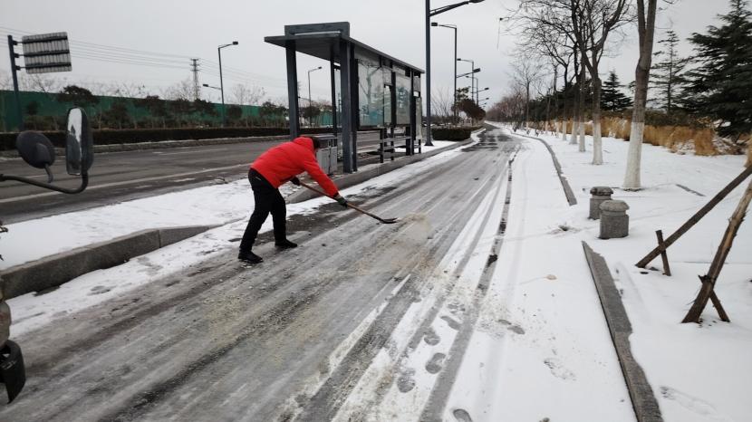 “融雪劑拋灑的時(shí)候要均勻拋灑,不要成團(tuán)堆積,這樣不僅融雪的效果不好,還會(huì)浪費(fèi)物資?!鳖A(yù)備黨員武新忠一邊說著,一邊示范著給其他隊(duì)員。哪里的積雪最厚,哪里就有他們揮鍬鏟雪的身影。在融雪劑不能及時(shí)送達(dá)的情況下,他們就使用人工除雪的方式,不斷檔、不離線、不缺位的清除路面積雪,保證路面不出現(xiàn)積雪狀況。為堅(jiān)決完成上級(jí)“雪停路凈”的掃雪除冰任務(wù),他們不畏嚴(yán)寒,冒著風(fēng)雨冰雪,晝夜不停,連續(xù)三天奮戰(zhàn)在掃雪的一線!以雪為令,雪不停,掃雪不止,一直堅(jiān)守在掃雪工作中,有效清除了區(qū)域內(nèi)的積雪,確保了交通道路的安全暢行。