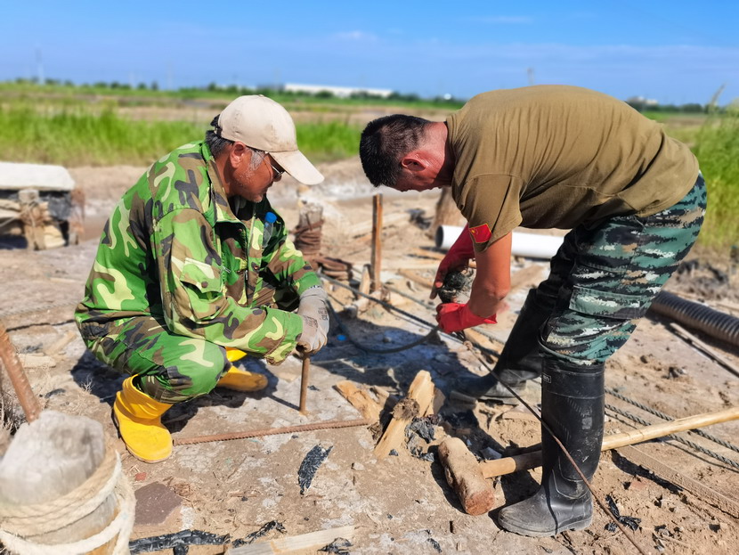 來到海州灣公司灘頭,遠(yuǎn)遠(yuǎn)望見幾名職工在鹽池里勞作,走近一看,組長夏軍正帶領(lǐng)一組人整修塑苫池。“我們5點(diǎn)就出來了,趁早涼,趕緊把塑料布整理一下,布子上都是鹵,長了鹽就不好處理了,搞不好這鹵水還會淌到外面去,造成浪費(fèi)......”邊說著邊用肩膀頭子蹭一下眼角的汗水,手里的活一直沒停。據(jù)了解,海州灣公司承接臺北礦鹽和鈣液兩大產(chǎn)業(yè),經(jīng)濟(jì)比重占全公司收入60-70%,當(dāng)前雖然是高溫期,但是廣大職工搶抓汛期難得的晴好天時,每天清晨5點(diǎn)就在灘地上忙碌起來,汗水模糊了雙眼,額頭的汗水順著帽檐往下滴落,身上的衣服一直都是濕漉漉的,緊貼在身上,即便如此,他們也毫不在意,用他們的話:“看著池子里每時每刻都在落鹽,這點(diǎn)汗就沒白淌啊!”我們臨走的時候,夏軍還不忘說:“今年我們保證鹽量突破2萬噸,不虧損?!?/span>