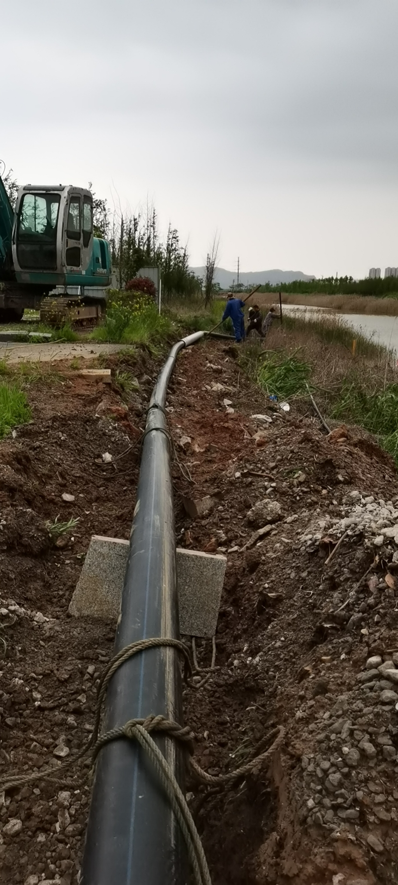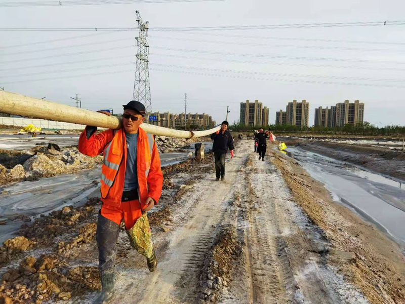 鏡頭四:新光路鹽河邊被開(kāi)發(fā)區(qū)污水管道施工損壞的灌西鈣液管道,搶修工作正在緊鑼密鼓的進(jìn)行中。爭(zhēng)取早一天完成就能早一天開(kāi)機(jī)打鹵,將損失減少到最小。