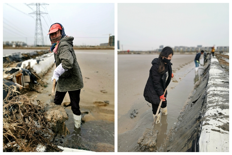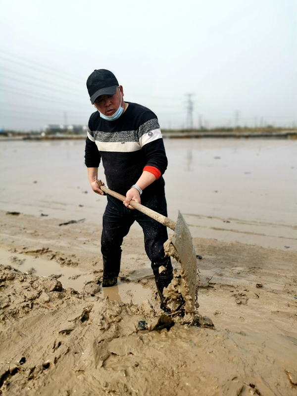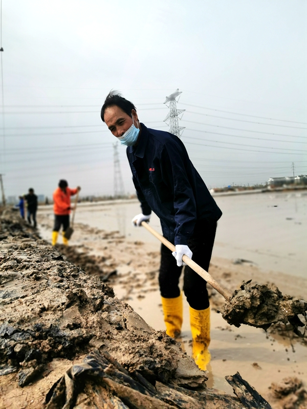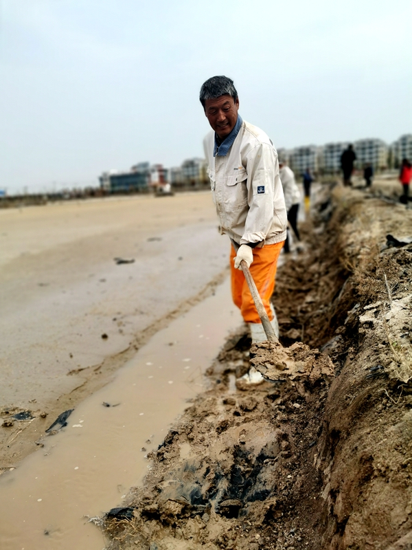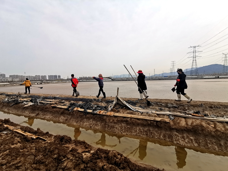 往東邊看,先鋒東灘黨旗招展分外鮮紅,海州灣公司18個單元職工、3名班組長全員出動馳援大浦工區(qū)協(xié)同重整410畝閑置鈣鹽灘地。引水入溝、翻泥上堰、腳踩和整、鐵掀蹋平,動作嫻熟。1200余米的10余條池堰僅用一天的就順利完工。