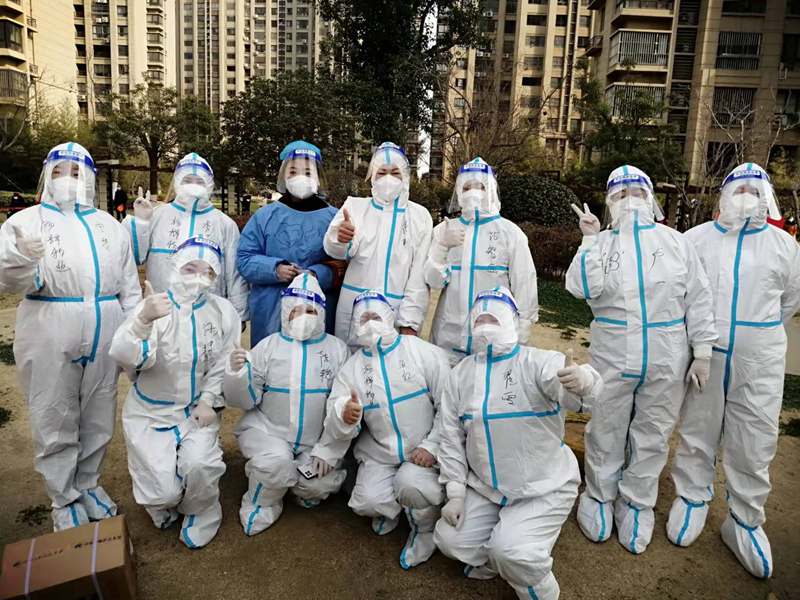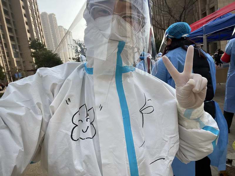 ? 312日,晴,800到達社區(qū)核酸采樣點,準備上崗,社區(qū)負責人給我們進行了“防護服穿脫”及防疫知識的講解學習等一系列十分細致地培訓后,有點興奮的穿好“大白服”,帶上手套、頭套和面罩,社區(qū)阿姨還幫我在衣服上畫上了可愛的涂鴉;