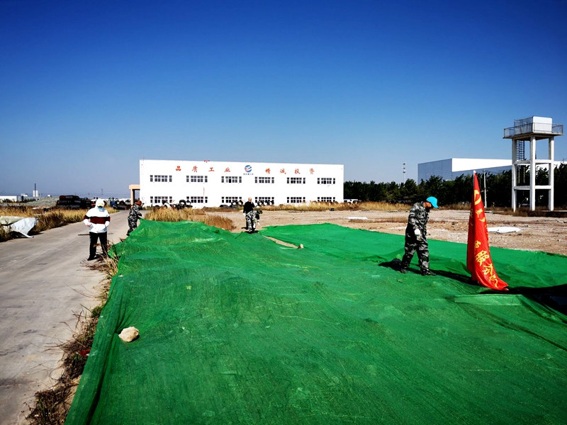 全體工作人員頂著烈日對黃土裸露區(qū)域進行覆蓋。大家分工明確,有條不紊,一邊清理廢棄垃圾,一邊小心謹慎的扯著防塵網(wǎng)布與迎面吹來的大風(fēng)沙土博弈。大家不怕臟、不怕累,個個奮勇爭先。經(jīng)過半天的辛苦勞動,就完成了近萬平方的露天黃土覆蓋工作。放眼望去,一片“綠草茵茵”,看似不可能完成的任務(wù)在大家的同心協(xié)力下順利完工,自豪和喜悅油然而生。
