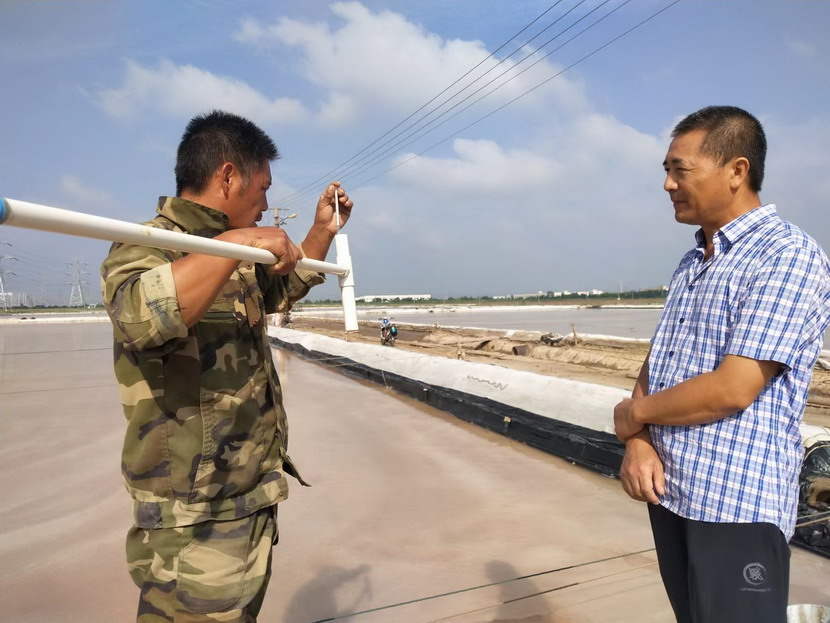 上圖為礦鹽生產(chǎn)顧問王緒前在現(xiàn)場指導(dǎo)測量鹵水波美度及相關(guān)數(shù)據(jù)