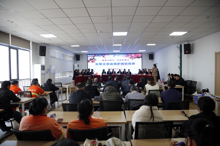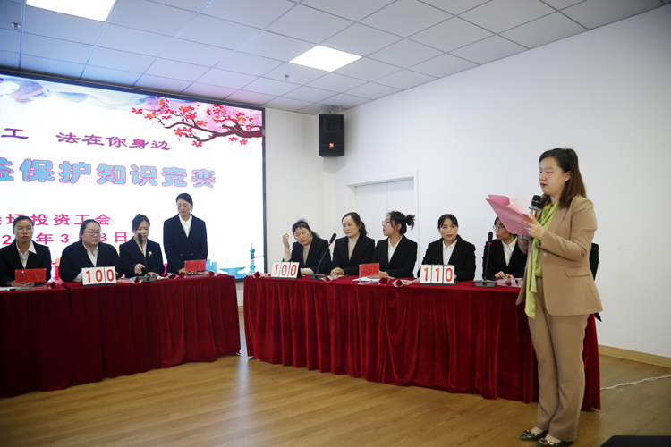 3月8日,投資公司工會在環(huán)衛(wèi)運(yùn)營管理中以“情系女職工 法在你身邊”為主題,舉辦 “女職工權(quán)益保護(hù)”知識競賽。投資公司黨委書記、董事長、總經(jīng)理莊清付,黨委副書記、工會主席劉剛,副總經(jīng)理?xiàng)钍孛?,各單位黨政工、工會女工委成員、悅升機(jī)關(guān)全體員工觀摩比賽。