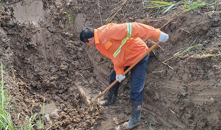 市政分公司組織搶修人員迅速到場(chǎng),調(diào)集挖機(jī)與搶修材料,有序開(kāi)展應(yīng)急搶修。維修人員首先對(duì)漏水管道實(shí)施開(kāi)挖,經(jīng)過(guò)維修人員仔細(xì)挖開(kāi)后確定直徑110PVC管道老化導(dǎo)致管道連接端裂開(kāi)。查明原因后,制定了相應(yīng)可行的搶修方案。搶修過(guò)程中,大伙不畏困難、分工有序,相互協(xié)作,在滿是泥濘的坑中開(kāi)展維修作業(yè)。機(jī)械開(kāi)挖、人工配合清淤、更換損壞管道、增設(shè)哈夫節(jié)等一系列的步驟,一通操作下來(lái),搶修人員人人汗流浹背。經(jīng)過(guò)3個(gè)多小時(shí)連續(xù)奮戰(zhàn),高效完成此次搶修任務(wù)。