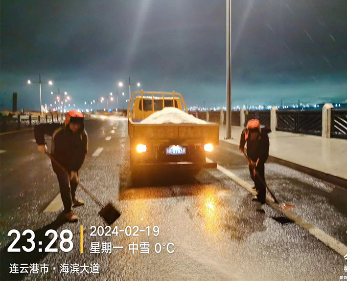 該公司迅速啟動(dòng)突發(fā)天氣應(yīng)急保障預(yù)案,近30余名道路應(yīng)急排險(xiǎn)突擊隊(duì)員,在公司統(tǒng)一按排下 ,裝車備運(yùn)融雪鹽斤近15噸,現(xiàn)場(chǎng)工作中隊(duì)員們士氣高漲,無所畏懼。夜間8時(shí)左右,10余名黨員先鋒,兵分三路再次安全有序奔赴燒香河、海濱大道、228等路段橋梁,無懼大風(fēng)夾著冰雨顆粒吹打臉頰,兩人一對(duì)、三人一組、揮動(dòng)手中鐵銑,汗水與冰雨濕透橙色衣衫,經(jīng)過近4個(gè)多小時(shí)努力奮戰(zhàn),人工撒放融雪鹽斤近20余噸,高質(zhì)高效保障近30座橋梁安全通暢。