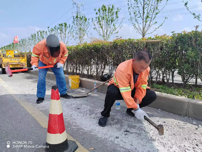 228省道西側(cè),班長姚功巡查時發(fā)現(xiàn),有近50多米長混凝土攪伴物拋灑主干道路面,如不及時處理,嚴重影響路面行車安全。班長姚功及時召集隊員,馬不停蹄趕赴道路現(xiàn)場。上午10時左右,室外氣溫已經(jīng)直逼35℃,大家顧不上天氣的炎熱,揮動手中鐵錘,不停地震動路面“凍結(jié)”已久的水泥,黨員胡可貴與同事徐育軍、伏彩林主動參戰(zhàn),交替使用手中的撬棍,盡管汗水浸透橙色衣衫,雙手磨出了血泡,大家也沒有叫苦叫累,經(jīng)過近三個多小的努力奮戰(zhàn),終于恢復(fù)原有黑色柏油路面。